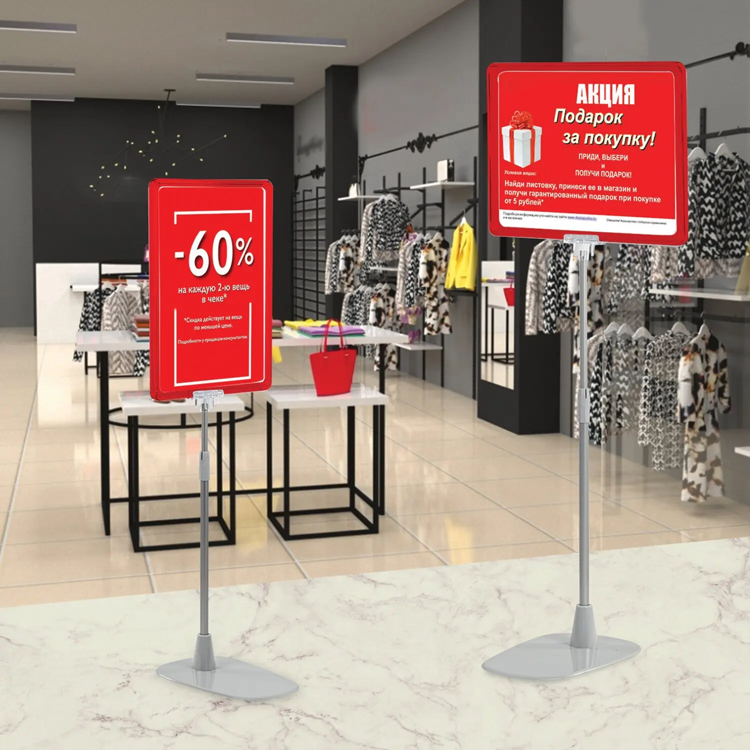 Набор включает в себя пластиковую рамку формата А4 красного цвета, антибликовый карман формата А4, алюминиевую телескопическую трубку с максимальной длиной 550 мм, держатель рамки, пластиковую подставку серого цвета. С помощью данного готового решения можно разместить информацию в различных заведениях: ресторанах, кафе, кондитерских, кофейнях, офисах продаж, магазинах.