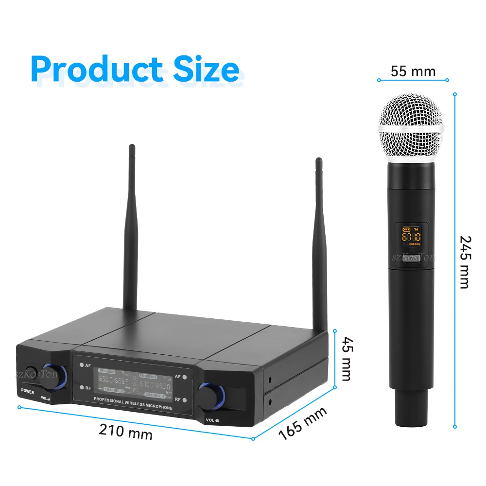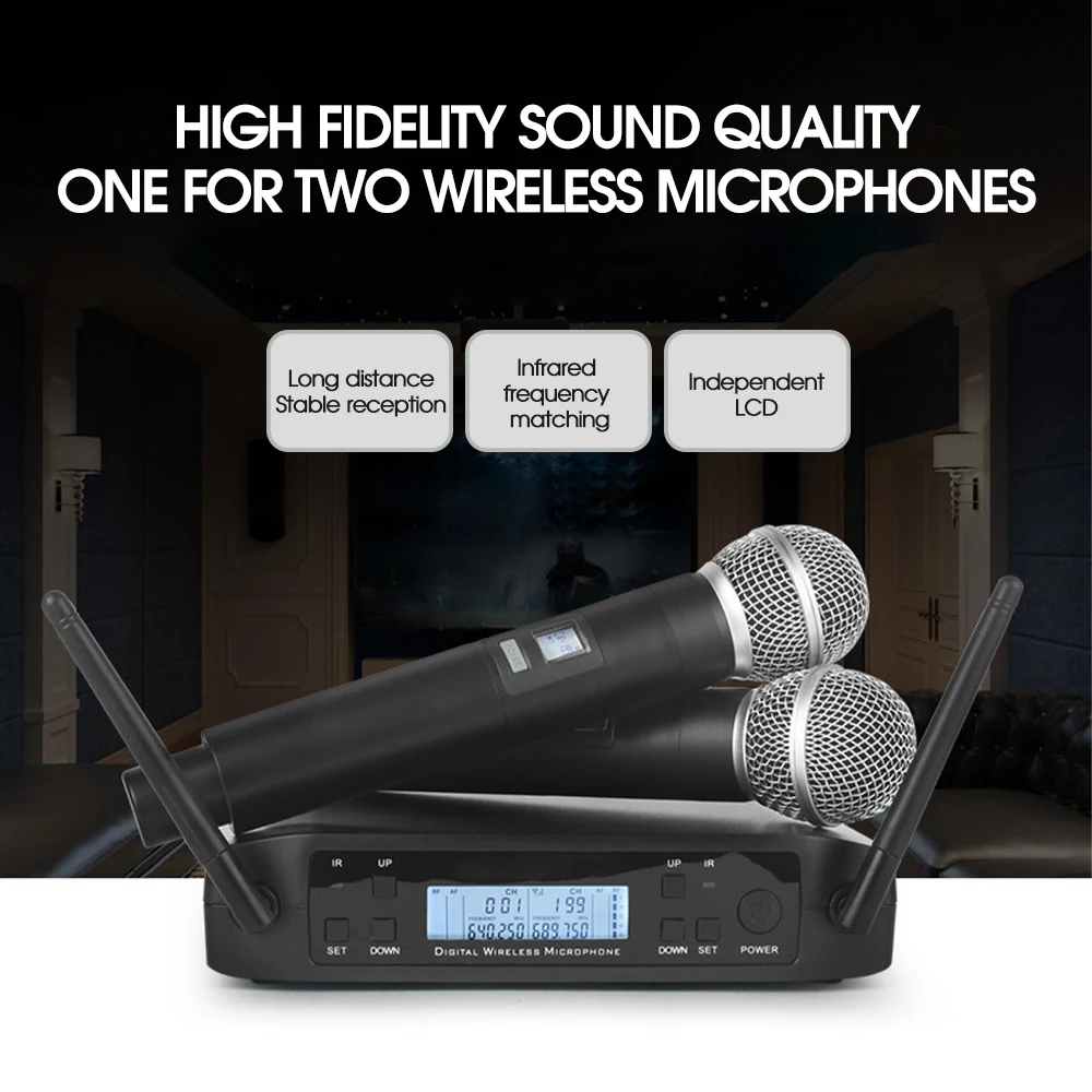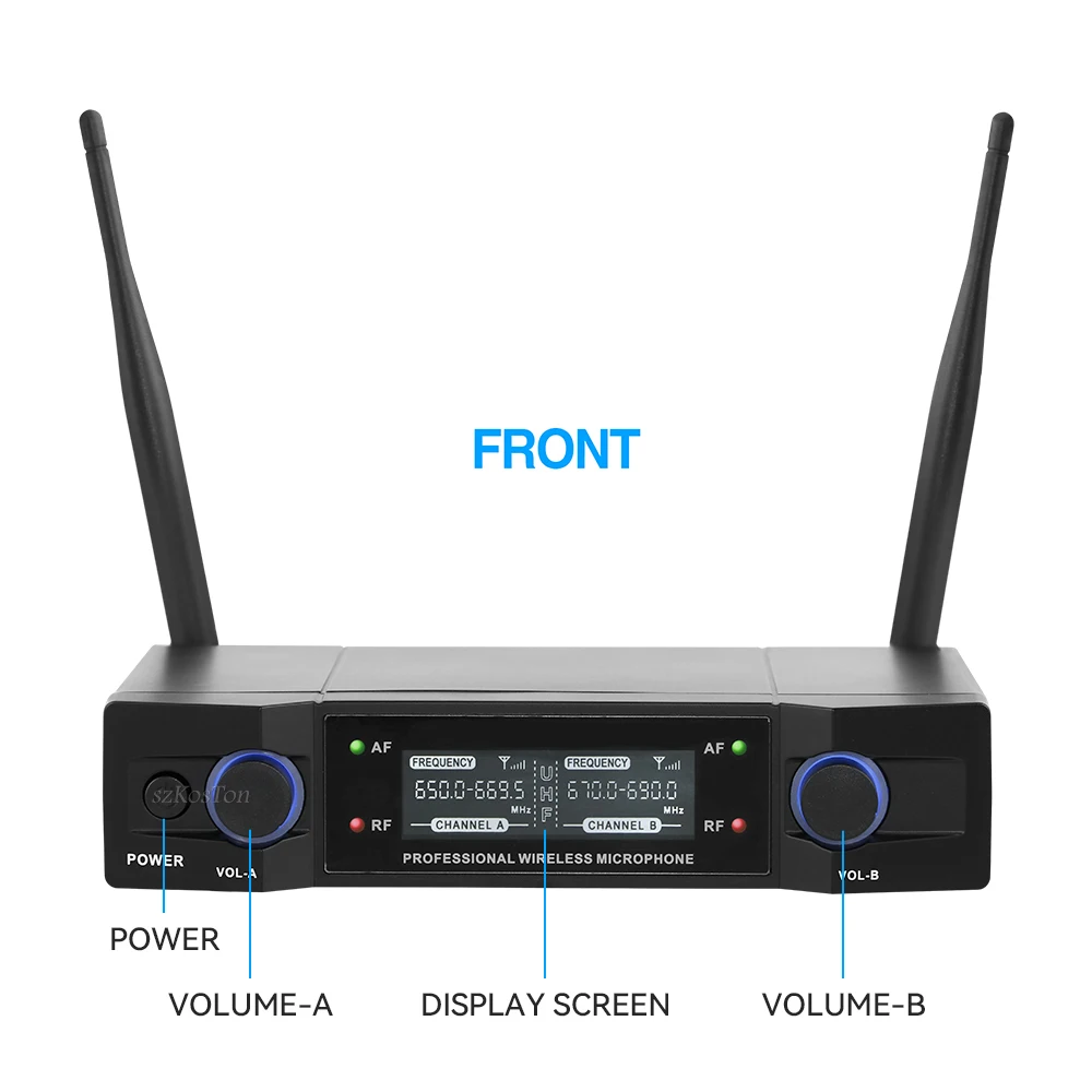 Высококачественная Беспроводная Производительность: двойная UHF Беспроводная микрофонная система с выбираемой частотой. (640 МГц-690 МГц)