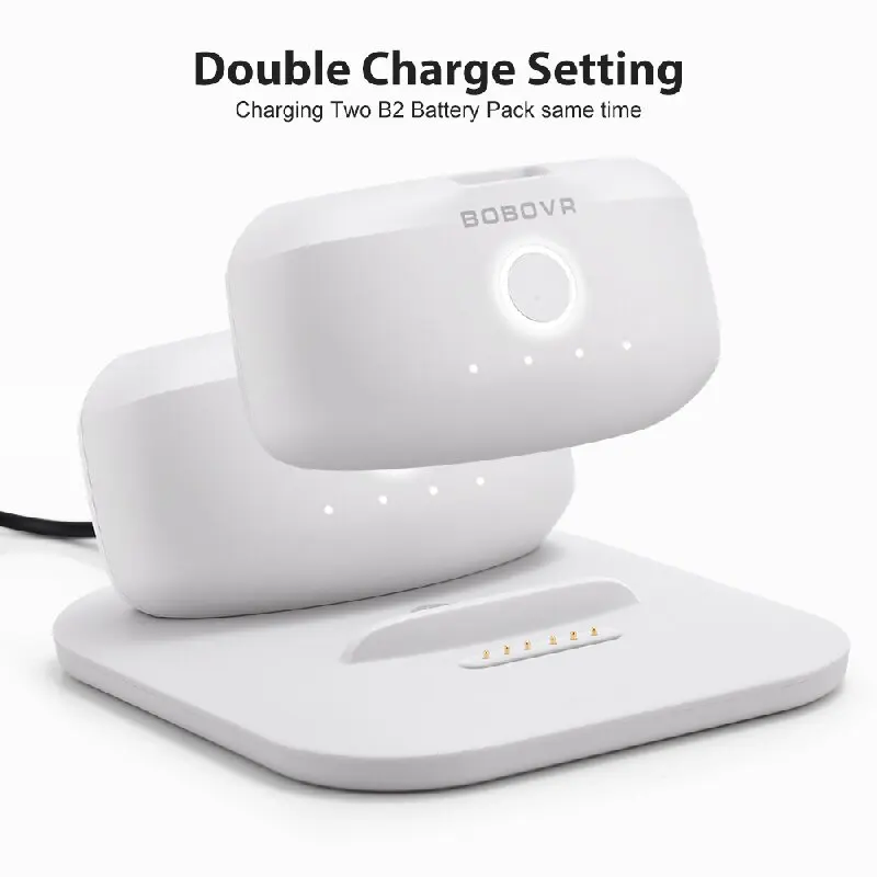 Двойной зарядный дизайн:Зарядная станция принимает очень тонкий и простой языковой дизайн, который экономит место на рабочем столе и имеет 2 положения зарядки, которые могут заряжать 2 аккумуляторных блока BOBOVR B2 одновременно;