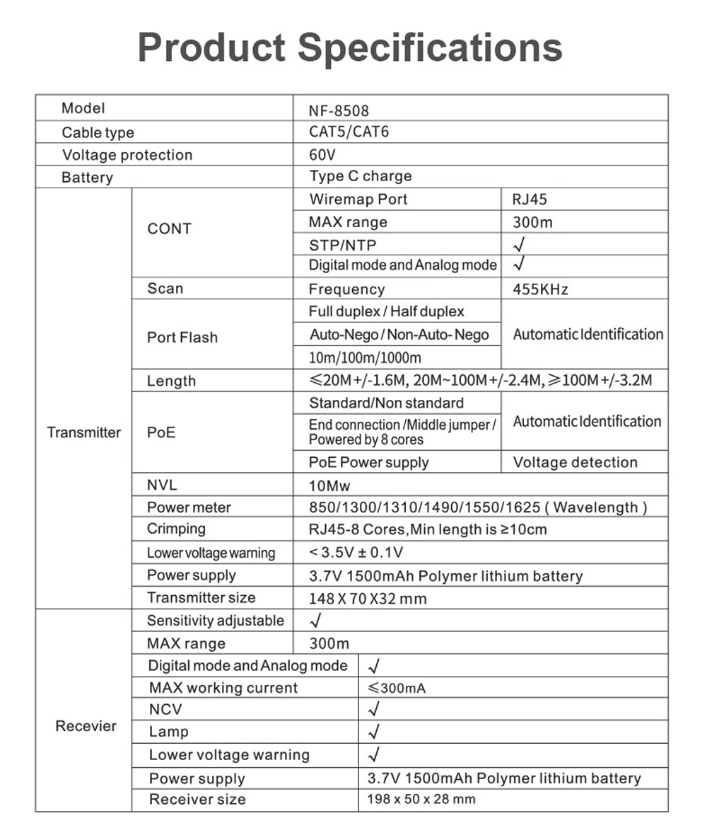 4. Возможность измерения CAT5, CAT6 длина кабеля точно радиус действия составляет 2,5 м ~ 200 м.