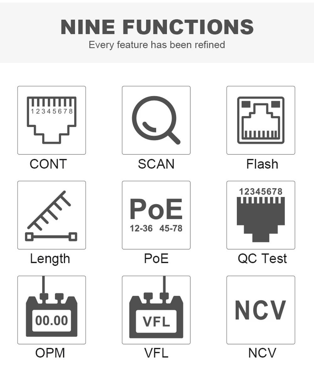 5. Функция POE: он может проверить информацию о стандартном POE устройстве, например, о напряжении POE, полярности источника питания, режиме питания, а также о типе PSE (af или по стандарту).