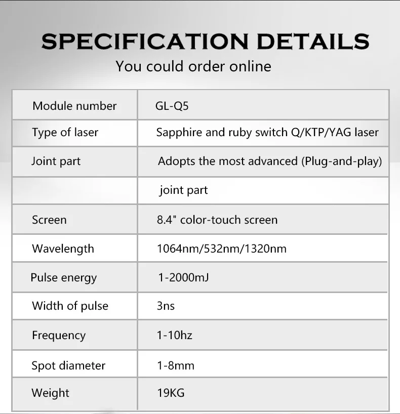 Мы продаем Q-Switched лазерные машины, которые могут безопасно использоваться в любом месте на лице и теле, и так же самые лучшие машины доступны для выполнения работы. С помощью этих лазеров профессиональные и любительские татуировки могут быть полностью удалены. Многие компании продают некоторые намного дешевле, менее эффективные машины. Наш Q-Switched лазер гораздо безопаснее и обеспечивает более безопасные показатели по доступной цене.
