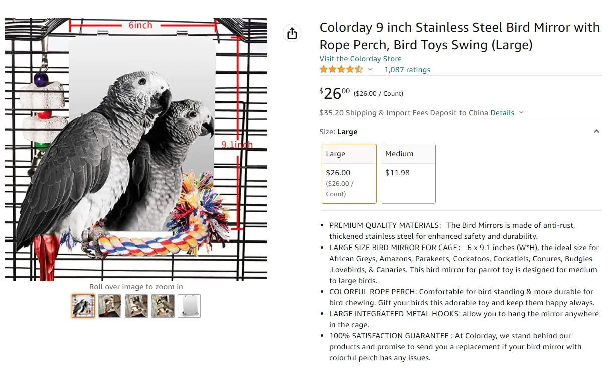 Большой размер птица зеркало для клетки: 6x9,1 дюйма (W * H), идеальный размер для африканские серые, амазонками, попугаев, какаду, австралийские, Conures, Budgies, любовное письмо, И Канары. Это зеркало для попугая предназначено для средних и больших птиц.