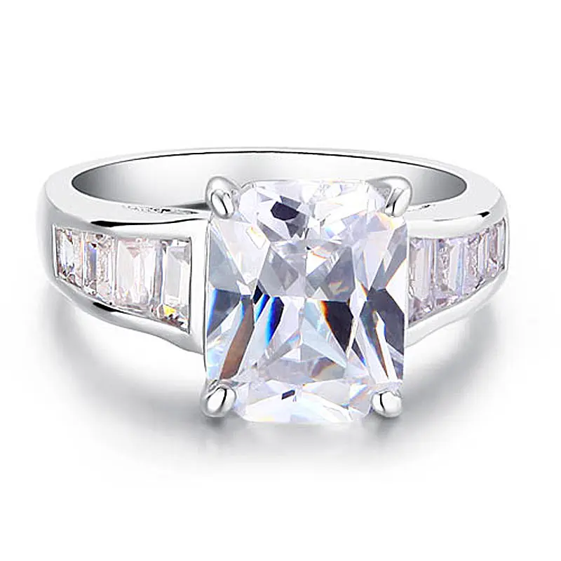 - Size : 6, 7, 8, 9 (Please select Ring Size)- Stone Size : 0.8 cm x 1 cm (2.5 Carat)- 8 Accents Emerald Cut Stones on the ring- Stone : Cubic Zirconia- Metal : Silver Color Metal- 18KRGP Stamp- Not easy to tarnish