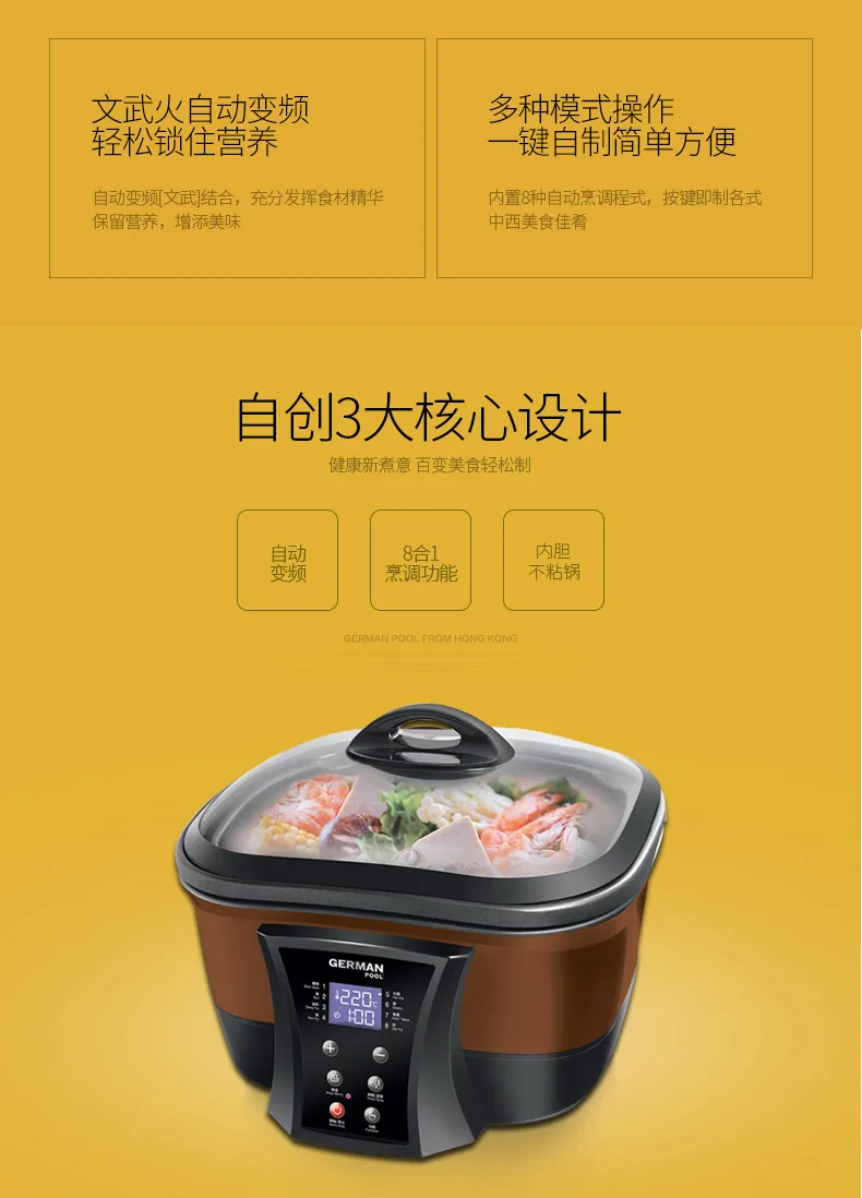 DFC-515 электрическая фритюрница с немецким кладоном восемь в одном Автоматическая многофункциональная электрическая плита электрический горячий горшок ВОК жареный рис Жареные горячий горшок Номер Сертификата: 2013010717626868 статус сертификата: эффективное Название продукта: жидкостный нагреватель (многофункциональные электронные кастрюли) Название продукта: Germanpool DFC-515 бренд: Germanpool Модель: DFC-515 Интеллектуальный Тип: Электрический/Другие функции: жареный жареный горшочек на пару тушеное мясо: китайский, горшочный горшочек Классификация цвета: черный кофейник Размер: 21 см (включая) -25 см (включительно) Размер: 5л обслуживание клиентов: вся страна электрическая плита мощность (значение): 1500 Вт Емкость горшка (значение): 5л