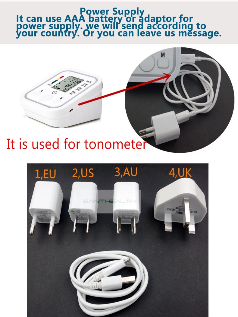 Информация о товаре: Имя: Монитор артериального давления в верхней части руки Производитель: Saint Health Размер: 126 мм (L) * 100 мм (W) * 53 мм (H) Артериальное давление: 20-280 мм рт. Частота пульса: 40-165 раз / мин Память для хранения: двойная 99 групповая память Герметизация: автоматический режим герметизации Размер манжеты: 22-32 см или 22-48 см на выбор Питание: батарейки типа AAAA (не входят в комплект) / зарядка через usb Адаптер: в комплекте. Адаптер для евро, США, Австралии и Великобритании будет отправлен в зависимости от страны. Подсветка: 3 цвета подсветки на выбор Голосовая функция: английский или русский голос на выбор Что значит подсветка? Значит, при измерении всегда есть подсветка. Таким образом, вы можете четко видеть экран даже в темноте. И увидеть более ясно в дневное время. Кроме того, если у вас высокое кровяное давление, экран будет красным. если у вас немного повышенное артериальное давление, экран будет желтым. Если ваше кровяное давление в норме, экран станет зеленым. По сравнению с моделью без подсветки, легче увидеть результат, особенно пожилым людям. Что такое английский голос и русский голос? Это означает, что на протяжении всего измерения у него есть живой английский или русский голос. Он расскажет нам, как проводить измерения и результат. Если не хотите голос, его тоже можно выключить. При заказе выберите, пожалуйста, вам нужен английский или русский голос. Модель: 3colorRuVoice означает 3-цветную подсветку и русскую озвучку. Модель: 3colorRuVoice-22-48 означает 3-х цветную подсветку и русский голос, а манжета большая. Модель: 3colorENVoice означает, что он имеет 3 цвета подсветки и английский голос Модель: 3colorENVoice-22-48 означает, что он имеет 3-цветную подсветку и английский голос, а манжета - большая манжета. У какой модели есть подсветка и голос? При заказе название модели с 3цветом имеет подсветку и озвучку. 3colorRuVoice означает Русский Голос. 3colorENVoice означает английский голос. Название модели без 3-х цветов не имеет ни подсветки, ни голоса. Затем вы выбираете, вам нужна большая или обычная манжета. Название модели с 22-48 - большая манжета. Преимущество бренда Saint Health: 1; Мы продаем этот продукт в Китае более 15 лет, и это действительно здорово! Это известный китайский бренд, золотое качество! Мы продаем на Aliexpress более 7 лет. 2; Теперь модернизируем товар! Мы предоставляем 3 цветовые модели с подсветкой и русским или английским голосом на выбор. 3; Мы предоставляем инструкции на русском языке для русскоязычных стран и предоставляем адаптеры, такие как адаптер для евро, адаптер для Великобритании, США и Австралии. 4; Мы также добавили вариант с большой манжетой 22-48 см для тех людей, которым нужен тонометр с манжетой большого размера, чтобы следить за своим здоровьем. Для нас очень важно здоровье! И хороший томомер очень поможет! Подарите нашим близким!