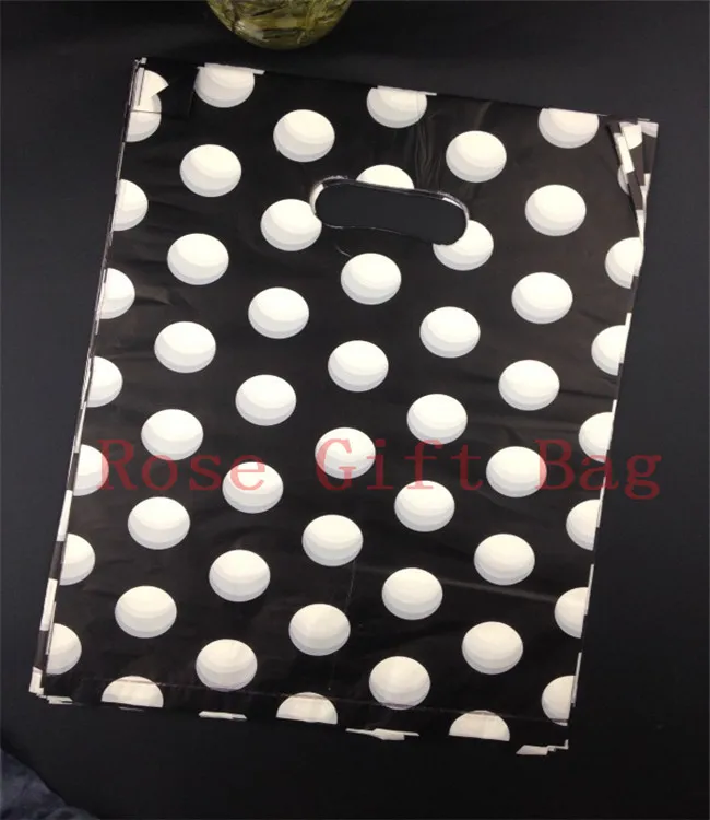 Оптовая продажа, черный пластиковый пакет с белыми круглыми точками 25x35 см 50 шт., пластиковые подарочные пакеты с ручкой для покупок и ювелирных изделий