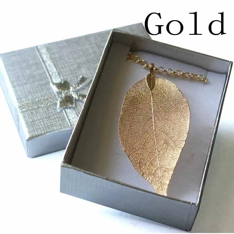 Горячая Распродажа, Золотое и серебряное покрытие, длинное колье с натуральным листом, окунутое в виде листика и подвески (отправка подарочной коробки), ожерелье с листьями, металлическая цепочка для свитера, Женская цепочка из ключицы
