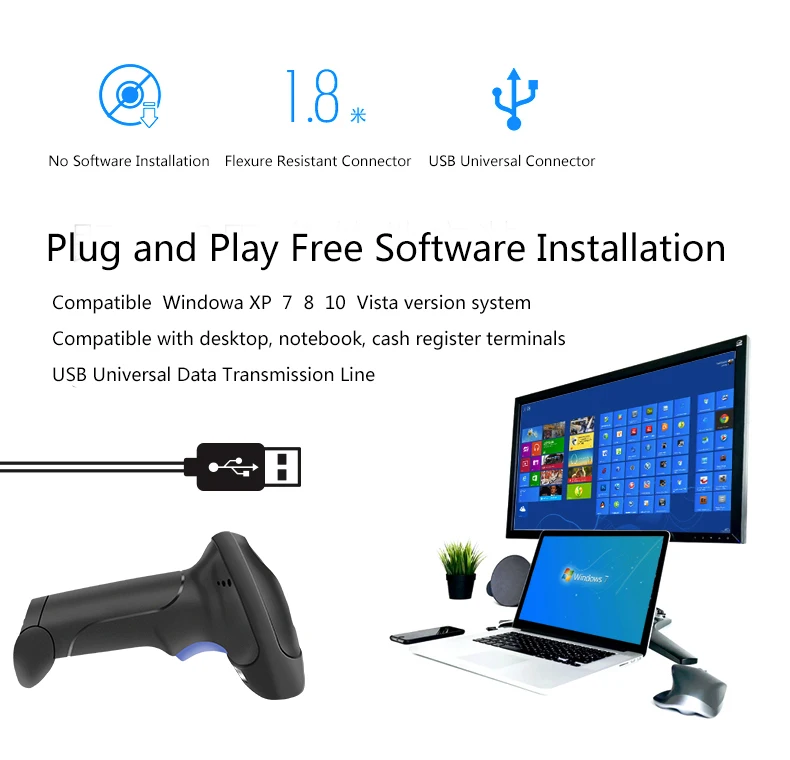 1. Новый дизайн, делает работу более комфортной. 2. Применение технологии изображения CMOS, простота сканирования, быстрая скорость. 3. Возможность многократной передачи данных, быстрое сканирование 1D/2D штрих-кодов и PDF417. 4. Лучший дизайн формы, анти-стук и quakeproof. 5. 2,4G мини-приемник, поддержка USB, порт RS232.