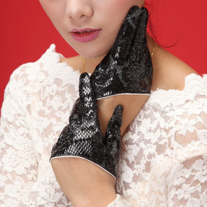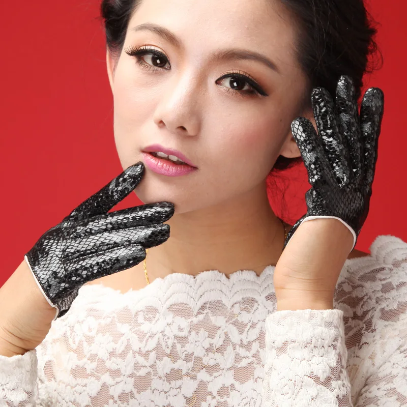 2015 женщины Новая половина Пальмовая 5-палец сексуальная мода Genuin змея леопард сетка вождения полюс танцы показать наппа кожаные перчатки варежки