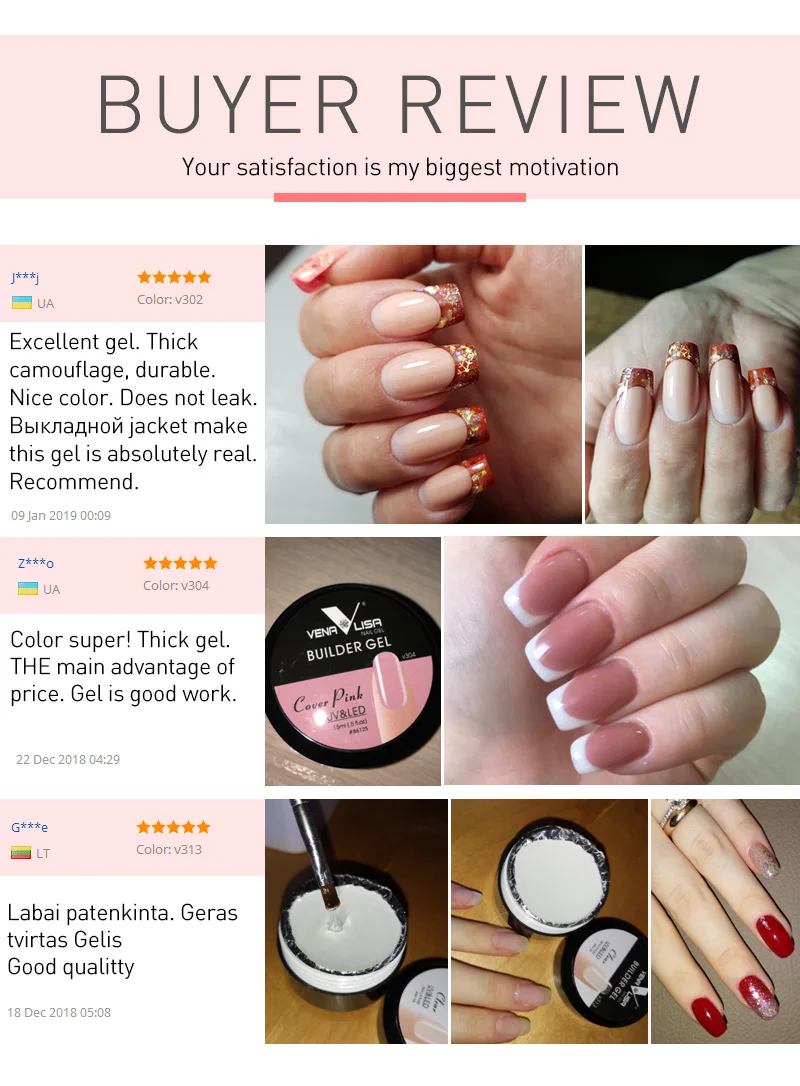 Шаг 1. Мытье рук, вытирание ногтей и удаление кутикулы Шаг 2. Нанесите тонким слоем Базовое покрытие venalisa, Обработав 1-2 минуты лампой для ногтей Шаг 3. Нанесите на форму ногтя, нанесите строительный гель с ручкой для нейл-арта, пусть строитель геля выглядит уникально, отверждение 1-2 мин с помощью ногтей lmap. Step4. Удалите форму ногтей, придайте им форму с помощью пилочки для ногтей, Очистите ногти Шаг 5. Нанесите верхнее покрытие и полимеризация с помощью лампы для ногтей, завершите!