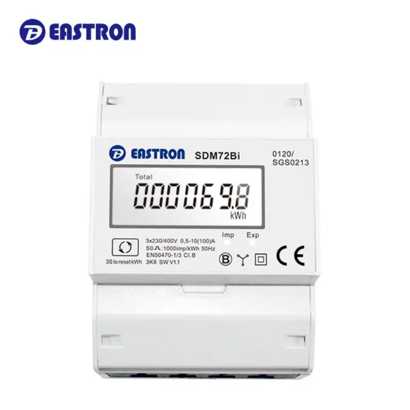 Энергометры SDM72Bi «с белым ЖК-экраном с подсветкой для префектного чтения» используются для двунаправленного измерения возобновляемой энергии. Блок измеряет и отображает импорт и экспорт активной энергии (кВт/ч) и мощности (W).