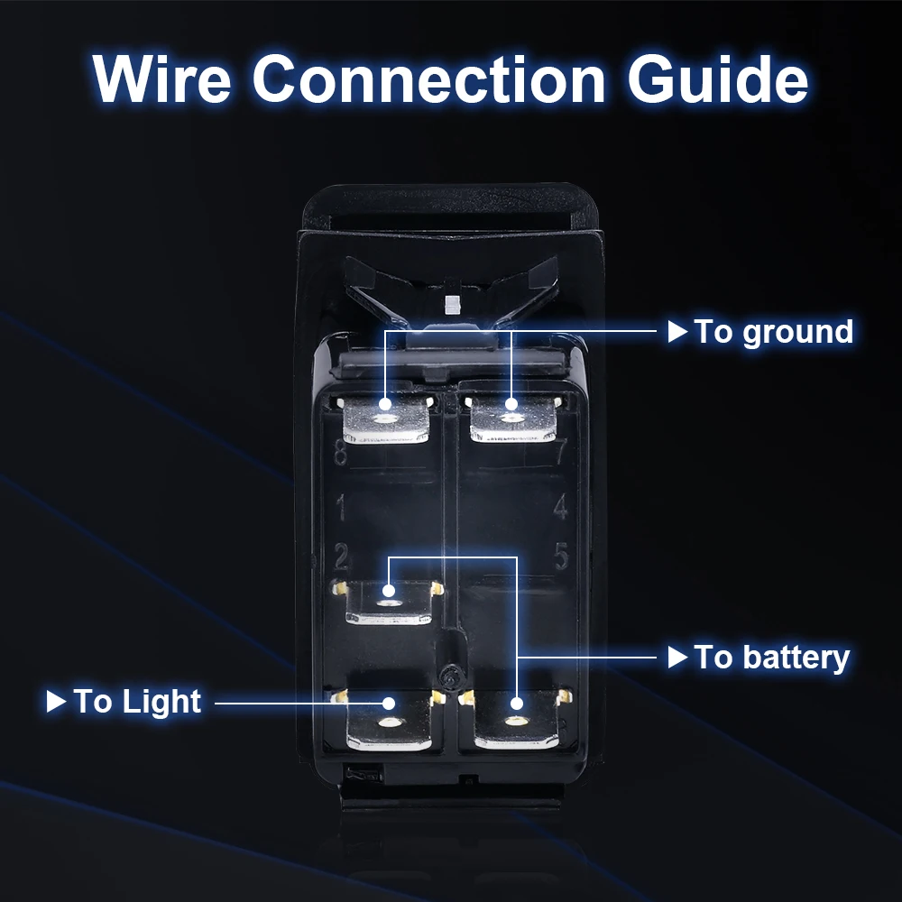 1. Это стандартный размер большинства отверстий для переключателей в современных транспортных средствах. 2. Верхний светильник включается при нажатии выключателя 3. Нижний СВЕТОДИОДНЫЙ индикатор является независимым и может быть подключен, чтобы отделить светильник приборной панели. 4. Оба светодиода имеют отдельные основания. 5. Нет задних препятствий между клеммами. 6. Нижний светильник, класс водонепроницаемости IP66. 7. Нет инструкций и прост в установке