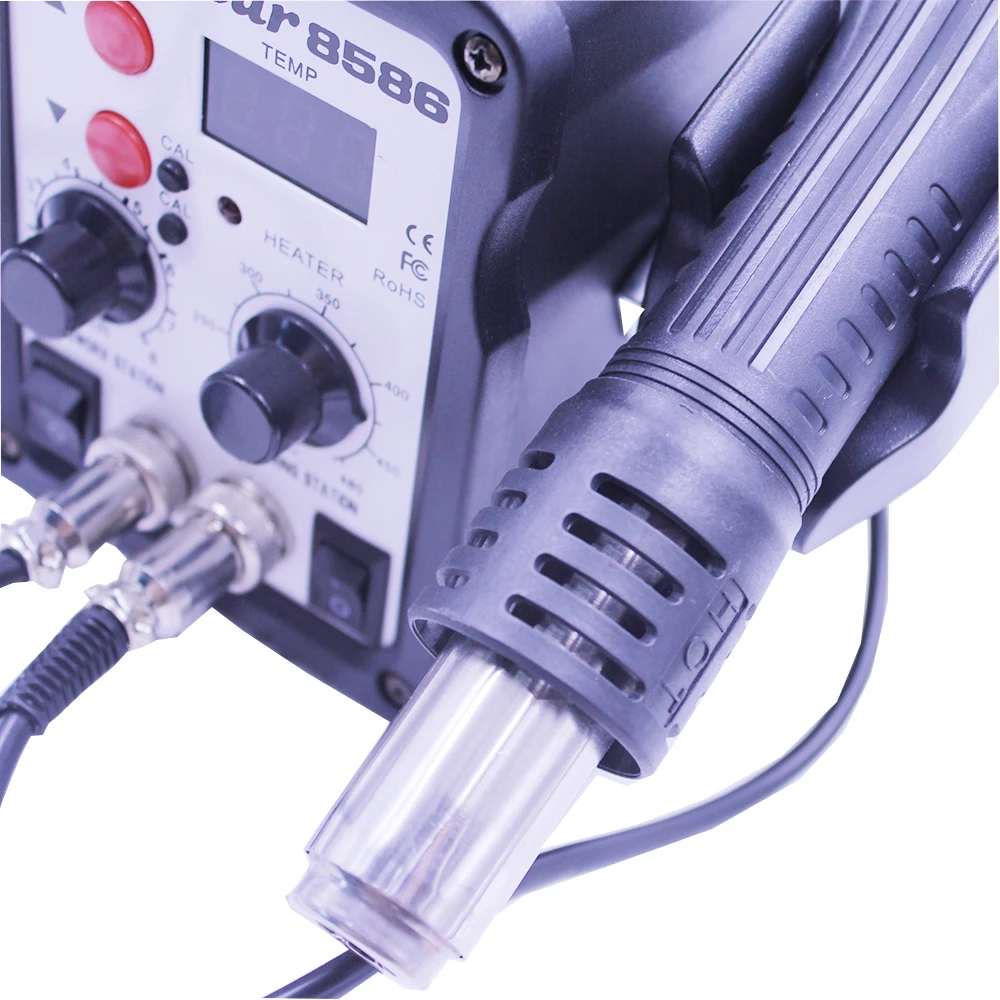 Пистолет горячего воздуха Мощность: 700 Вт Устойчивость: <2Ω Размер наконечника: <23 мм Стабильность температуры: ± 1 °C Вентилятор: Бесщеточный шар Воздушный поток: 120 л/мин (макс.) Шум: <45 дБ Контроль температуры: 100 ~ 450 °C Пайки горячим утюгом Мощность: 60 Вт Устойчивость: < 2Ω Стабильность температуры: ± 1 °C Железо: дизайн ESD Материал нагревателя: никель-металл Контроль температуры: 200 ~ 480 °C Примечание: Перед использованием ознакомьтесь с руководством пользователя Подходит для: распайки нескольких компонентов, таких как SOIC ,CHIP, QFP, PLCC, BGA и чувствительные к температурам компоненты (особенно для плоских кабелей и кабельных разъемов); Подходит для горячего сжатия, нагрева, депиляция, деформация, размораживание. Подогрев и резиновая пайка, и так далее.