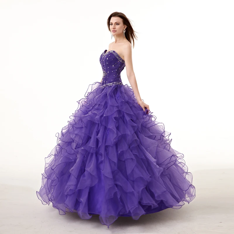 2016 заказ Фиолетовый органзы Роскошные бисером, блестками Кристалл оборками бальное платье Quinceanera платье вечернее платье