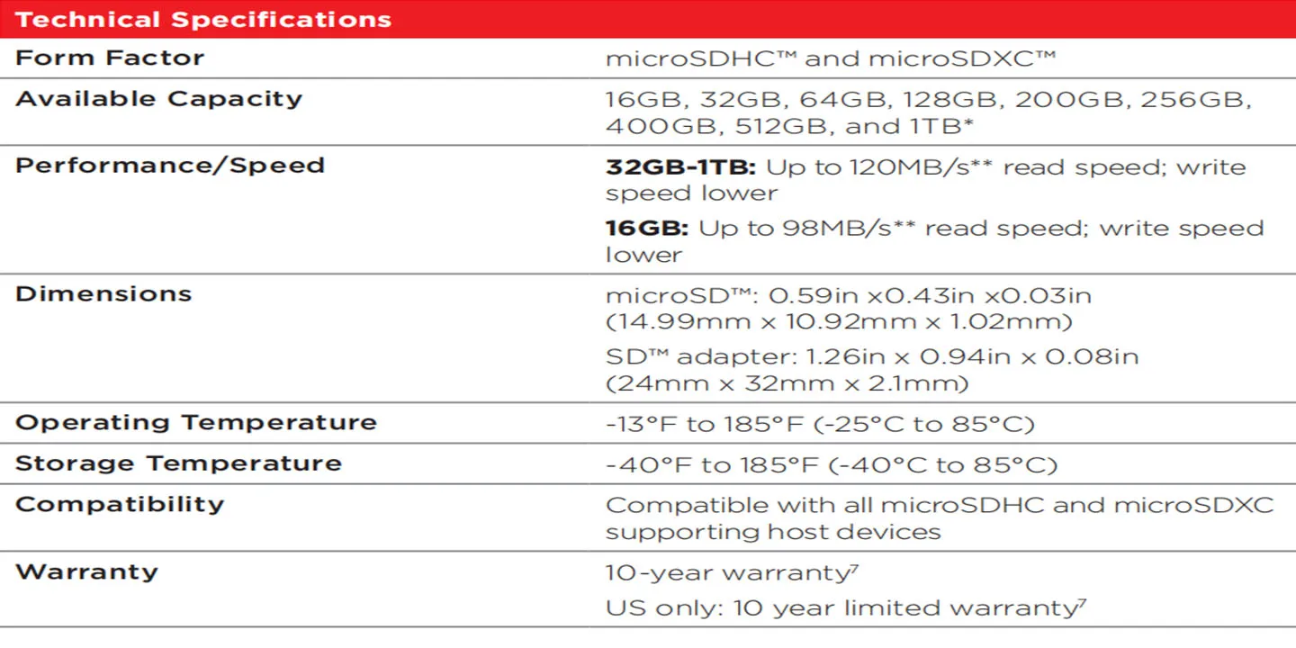 [Для 32 ГБ-1 ТБ] скорость чтения до 120 Мб/с, разработанная с собственной технологией для достижения скорости выше UHS-I 104 Мб/с, требуют совместимых устройств, способных достичь такой скорости. Скорость записи ниже. На основе внутреннего тестирования; Производительность может быть ниже в зависимости от хост-устройства, интерфейса, условий использования и других факторов. 1 Мб = 1000000 байт. [для 16 Гб] скорость чтения до 98 Мб/с; Скорость записи ниже. На основе внутреннего тестирования; Производительность может быть ниже в зависимости от хост-устройства, интерфейса, условий использования и других факторов. 1 Мб = 1000000 байт.