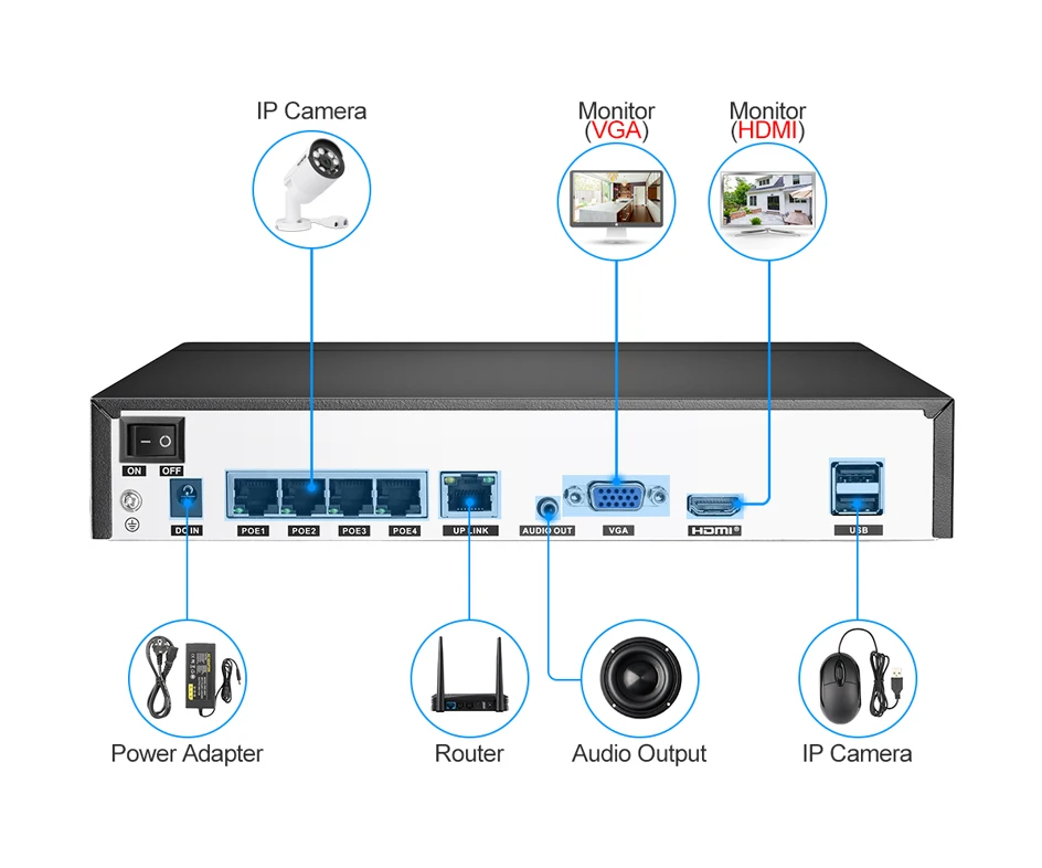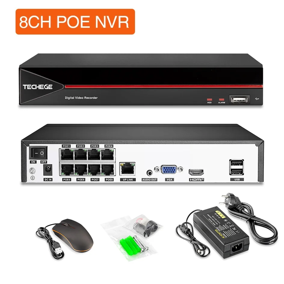 Примечание:Это 48 В POE NVR, он совместим только с ip-камерой 720P/960P/1080P/3MP/4MP/5MP POE!