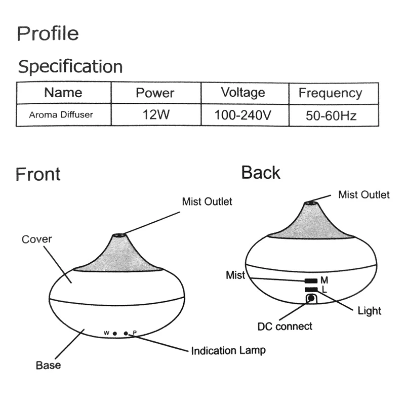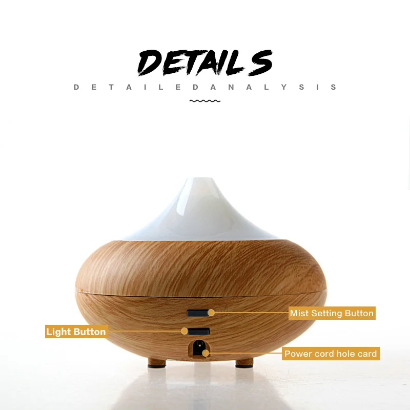Функции: 1. Хороший дизайн украшения, чтобы соответствовать вашей жилой площади. 2. Ночной свет/фоновый свет на выбор 7 видов цветов на выбор. 3. Лучше всего работает с эфирным маслом. 4. Ультразвуковой увлажнитель излучает холодный туман. 5. Может использоваться в качестве стерилизатора путем капания алкоголя или уксуса. 6. Низкое энергопотребление. 7. Функция автоматического отключения при низком уровне воды. 8. Режим Интервала для работы в течение более продолжительных часов (до 6 часов).