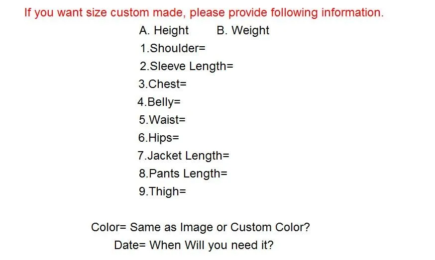 Вы можете измерить свои измерения и выбрать цвет (по умолчанию, как на картинке), и написать их на примечании, или вы можете нажать на сообщение продавца, затем отправьте мне все измерения и цвет или нажмите онлайн-чат со мной, когда вы заказываете костюм.