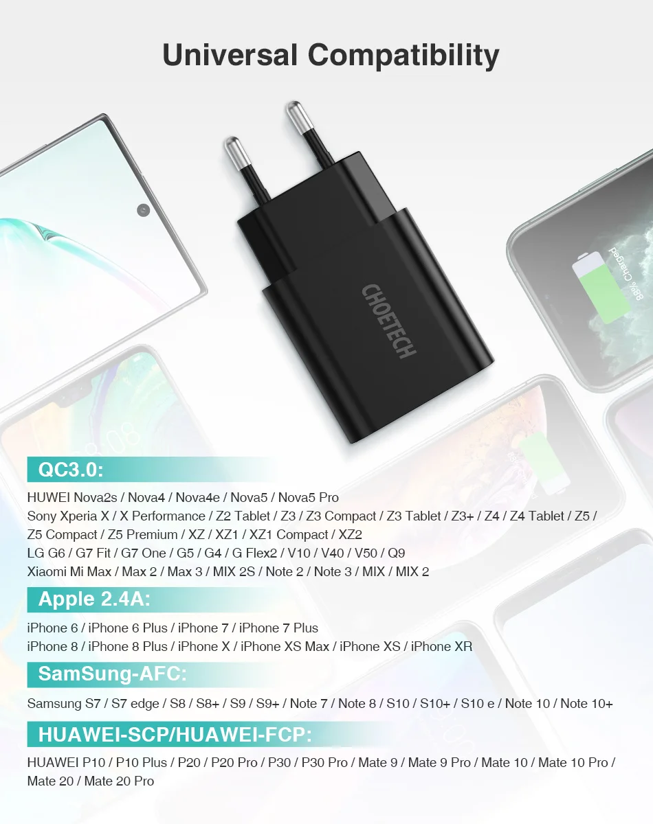HUAWEI P10/P10 Plus/P20/P20 Pro/P30/P30 Pro/Mate 9/Mate 9 Pro/Mate 10/Mate 10 Pro/Mate 20/Mate 20 ProApple 2.4A:IPhone 6, iPhone 6 Plus, iPhone 7, iPhone 7 Plus,IPhone 8, iPhone 8 Plus, iPhone X, iPhone XS Max, iPhone XS, iPhone XR,iPhone 11,IPhone 11 Pro,iPhone 11 Pro MaxSamsung-AFC:Samsung S7/S7 edge/S8/S8 +/S9/S9 +/Note 7/Note 8/S10/S10 +/S10 e/Note 10/Note 10 +QC3.0:HUWEI Nova2s / Nova4 / Nova4e / Nova5 / Nova5 Pro Sony Xperia X / X Performance / Z2 Tablet / Z3 / Z3 Compact / Z3 Tablet / Z3 + / Z4 Tablet / Z5 / Z5 compact/Z5 Premium / XZ / XZ1 / XZ1 Compact / XZ2LG G6 / G7 Fit / G7 One / G5 / G4 / G Flex2 / V10 / V40 / V50 / Q9Xiaomi Mi Max / Max 2 / Max 3 / MIX 2S / Note 2 / Note 3 / MIX 2