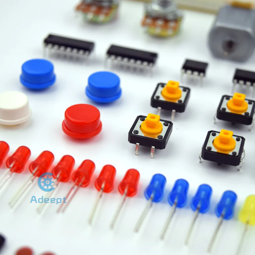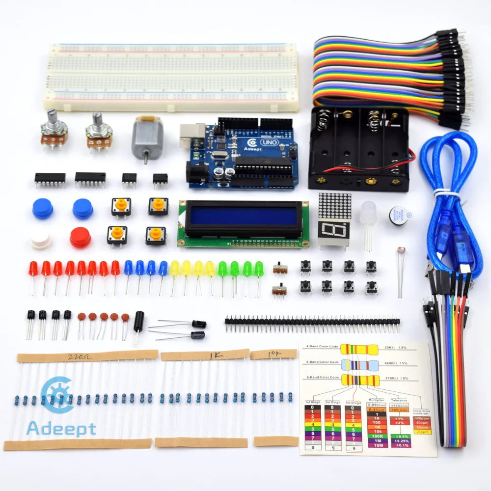 Посылка включает в себя: 1х плата Adeept UNO (Arduino UNO) 1x двигатель постоянного тока 1x L9110 мотор драйвер 1x LCD1602 1x Точка-Дисплей 1x 7-ми сегментный Дисплей 1x NE555 таймер 2x 74HC595 1x активный зуммер 1x фотопроводимость 1x переключатель наклона 2x переключатель 1x RGB светодиодный 8x красный светодиодный 4x зеленый светодиодный 4x Желтый светодиодный 4x синий светодиодный Резистор 16x (220Ω) 10x резистор (1 кОм) 5x резистор (10 кОм) 5x конденсатор (104) 2x конденсатор с алюминиевой крышкой (10 мкФ) 4x кнопка (большой) 8x кнопка (маленькая) 1 Кепка на пуговицах (красный) 1 Кепка на пуговицах (белый) 2x кнопка крышки (синий) 2x NPN транзистор (8050) 2x PNP транзистор (8550) 2x потенциометр (10 кОм) 1x держатель батареи 1x макет 1x USB кабель Соединительные провода от 40 до 40 мм 8x мужские и женские перемычки 1X Заголовок (40pin) 1x Ремешок резисторная карта 1x проект коробка