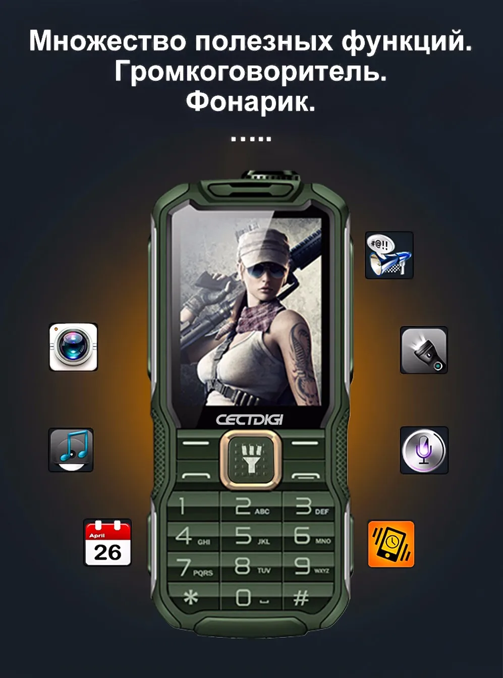 Новинка! Cectdigi T9900. Телефон с батареей 15800 мАч и режимом мобильного повер банка (зарядного устройства от батареи), четырех диапазонной сотовой связью, с громким динамиком, радио со встроенной антенной, двумя сим картами, защитой от ударов, защитой от влаги. Обновленная версия от cectdigi T8800, та же низкая цена, улучшенная начинка.