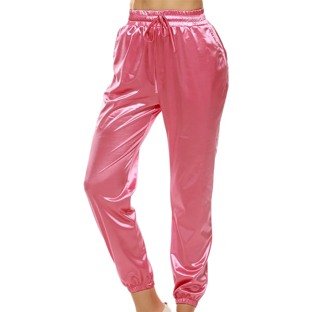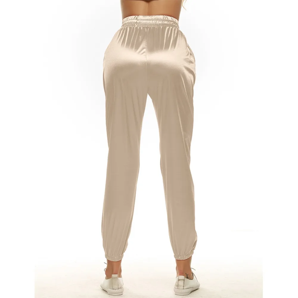 Мягкая атласная женщин повседневные брюки полной длины Твердые Высокая талия femme узкие брюки летние тонкие боковые карманы в швах шнурок брюки