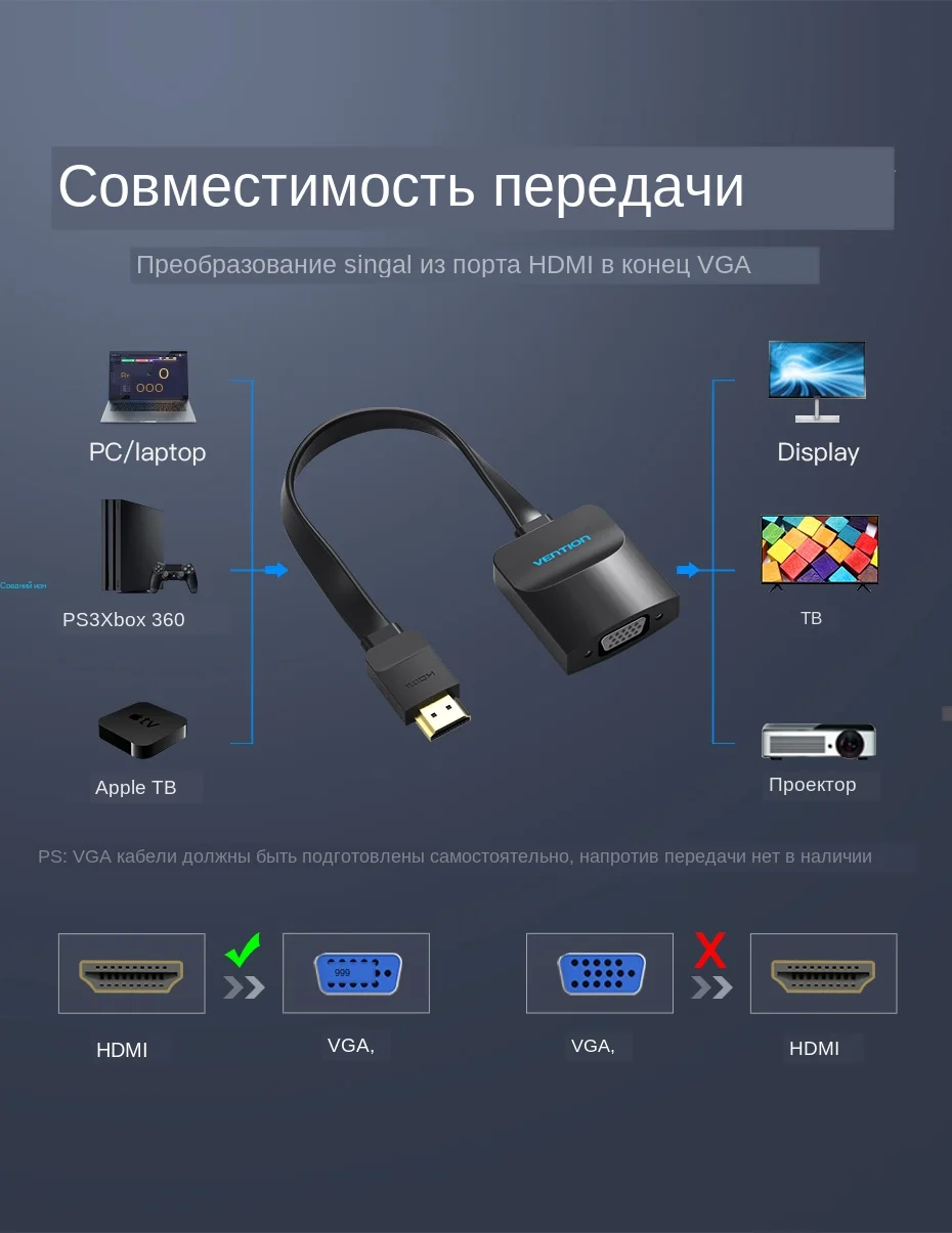 Примечание: 1. Этот товар подходит только для устройств с выходом HDMI (ноутбук/телевизионная приставка/PS4) и входом VGA (монитор/телевизор/проектор). 2. Если у вас PS4, телевизионная приставка или другое устройство высокой мощности, пожалуйста, выберите «модель с аудиовыходом и внешним питанием». 3. Подключайтесь и играйте - устройство подключается быстро, используется просто и не требует настройки. Товар обладает конвертером на базе встроенного чипа AG6200 и поддерживает горячую замену hot swap.