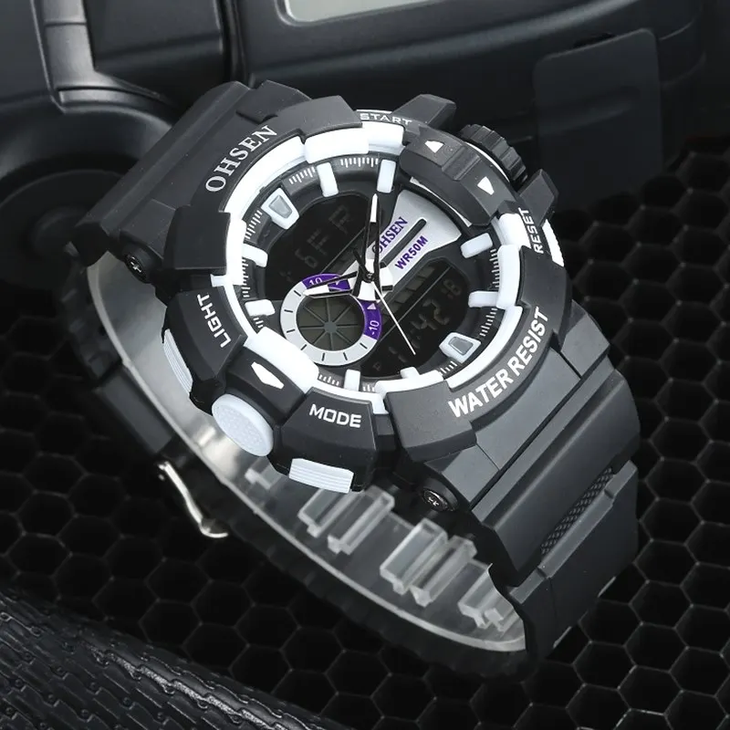 1. Серия спортивных часов бренда OHSEN, привлекательное сочетание спортивного и технологического шарма. 2. Передовые технологии производства, высококачественный мягкий силикон, хорошо носить и носить удобно. 3. Зазор светодиодный цифровой смешанный традиционный аналоговый дисплей с двумя часовыми поясами позволяет вам точно знать время независимо от того, где вы находитесь. 4. Функция секундомера предназначена для тех, кто любит спорт. 5. Будильник, день и дата, почасовой сигнал времени, ч цифровой дисплей времени. 6. EL подсветка позволяет четко определить время в темноте. 7. Водонепроницаемость до 5 атм ( Пожалуйста, не нажимайте клавиши Underwate ) 8. Батарея с длительным сроком службы 2 года, гарантия 12 месяцев по всему миру Спецификация: Бренд: OHSEN Тип дисплея: цифровой и аналоговый Диаметр чехла: 4,5 см (1,75 ") Толщина чехла: 1,5 см (0,60 ") Ширина ремешка: 2,2 см (0,85 дюйма) Материал ремешка: Резина Длина ремешка (чехол в комплекте): 26 см (10,25 ") Доступная длина ремешка: 16,5-23,5 см (6,50-9,25 дюйма) Механизм: кварцевый и цифровой Глубина водонепроницаемости: 50 метров Компоненты в комплекте: 1 Спортивные Наручные Часы 1 Руководство пользователяСоветы по обслуживанию: 1. Очистка неприменения химикатов, которые можно использовать с мягкой тканью, слегка влажной салфеткой. 2. Чтобы избежать бликов в высокой электромагнитной среде и избежать ударов. 3. Управление кнопкой нельзя проводить в воде. 4. Защитная пленка на столе остается только после снятия износа.