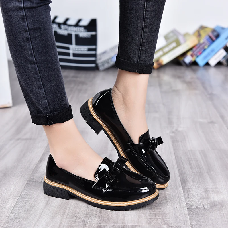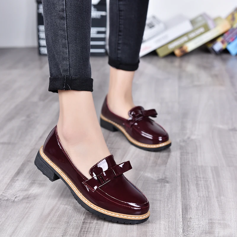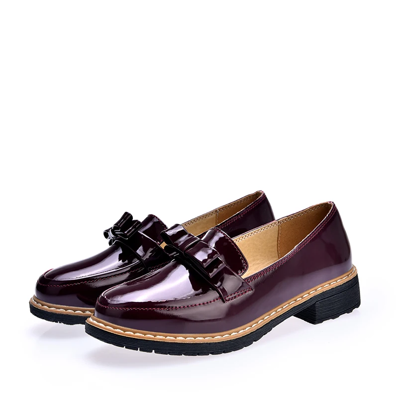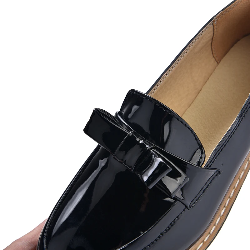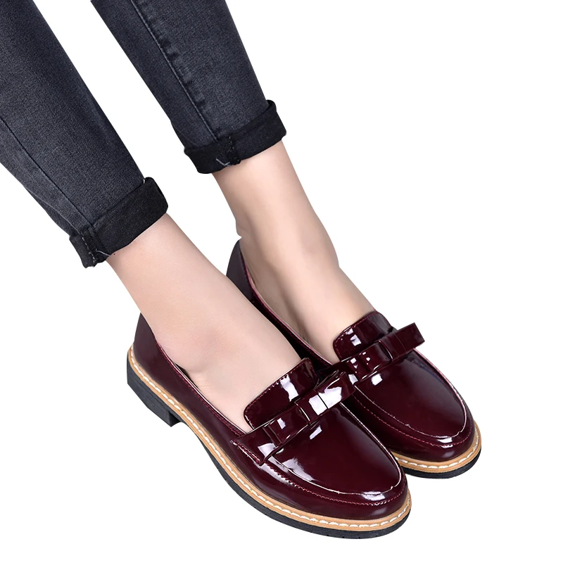 2017 Весна/осень, без шнуровки, круглый носок, женская обувь на плоской подошве, однотонный галстук-бабочка, с закрытым носком, лакированные кожаные туфли Размеры; Большие размеры 35-40, цвета: черный, красный