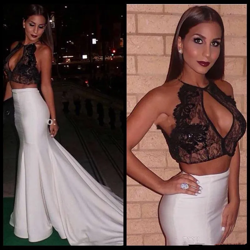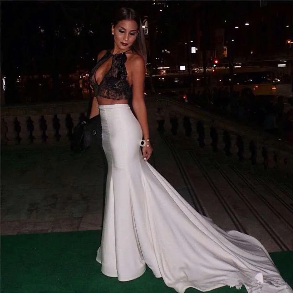 2017 Новый Дизайн Холтер Черное Кружево И Белый Сатин Два пьесы Русалка Пром Платье Vestido Де Феста Сексуальная Торжеств и Вечеринок платье