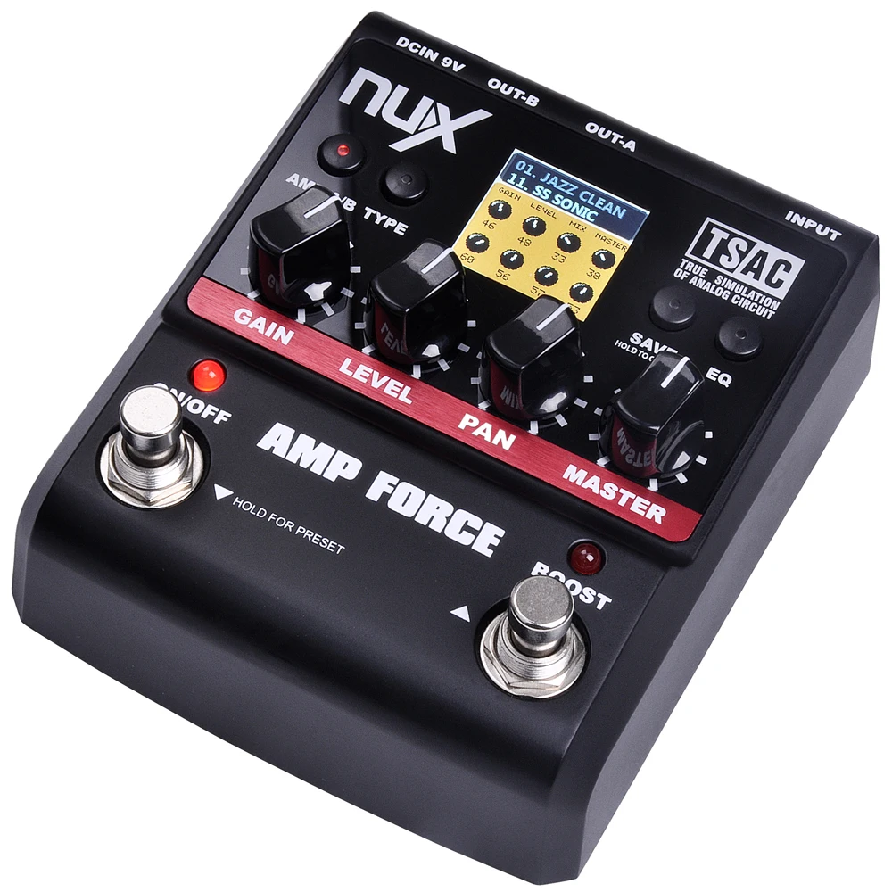Встроенный по технологии TS/AC (истинная имитация аналогового контура) усилитель Amp Force предлагает двенадцать звуковых усилителей теплой трубки в компактной двойной педали. Благодаря его двойному двигателю и выходу A/B усилитель позволяет смешивать два усилителя звука вместе и управлять ими на два выхода. К любому режиму можно установить переключаемые шумовые ворота и 12 моделей шкафов.