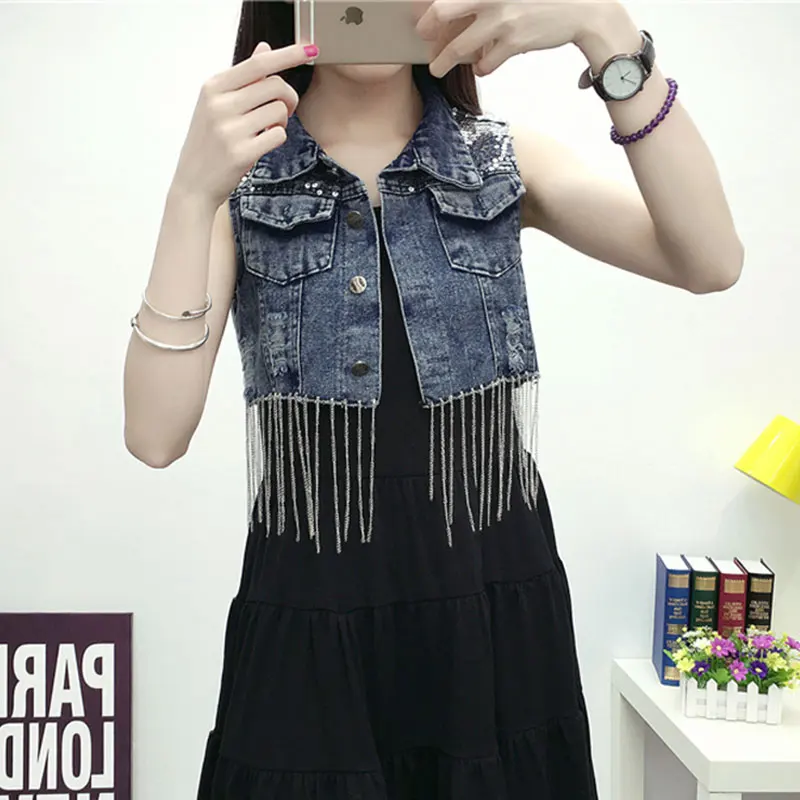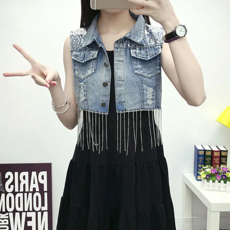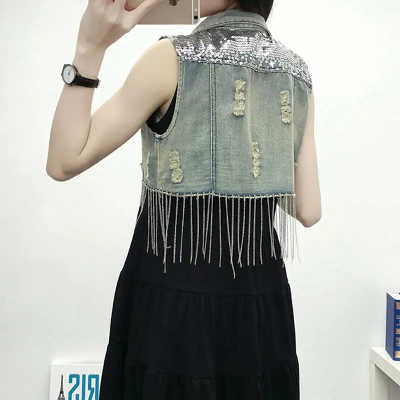 Fashion Tassle Sequined Denim Vest Women Frayed Vintage Single-breasted Short Vest Jacket Spring Summer Jeans Waiscoat Coletes