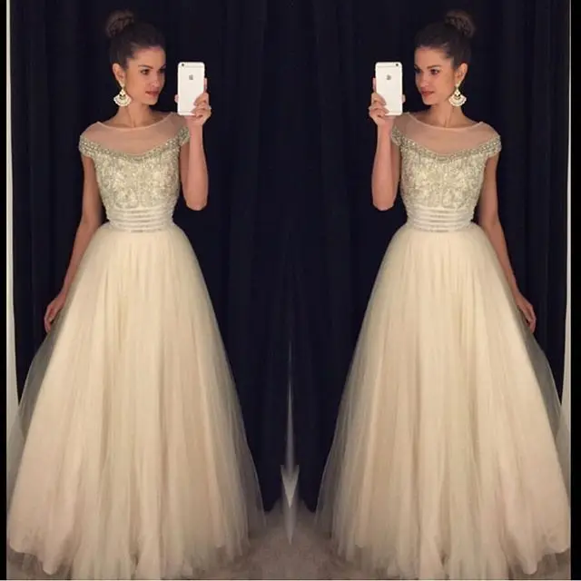 свадебные платья феста 2017 Свет Шампанское Пром Платья Длинные Бисероплетение Пояс Sheer Cap Рукавом Тюль для Торжеств и Вечеринок Платья