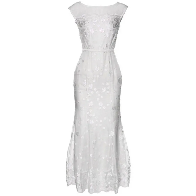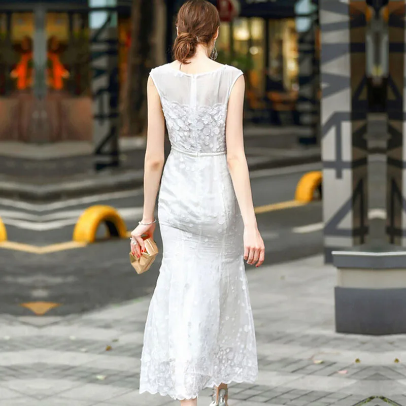 Изящное круглый вырез горловины без рукавов цветы Вышивка Кружева Русалка платье для женщин Мода элегантный чистый цвет платье футляр платья