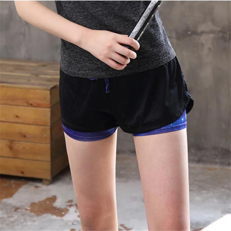 поддельные 2 шт. Женщины Спорт Фитнес Йога Шорты 2017 Спортивные Шорты Спортивные Стволы Дамы Спортом Бег Короткие Фитнес Магистральные Бег