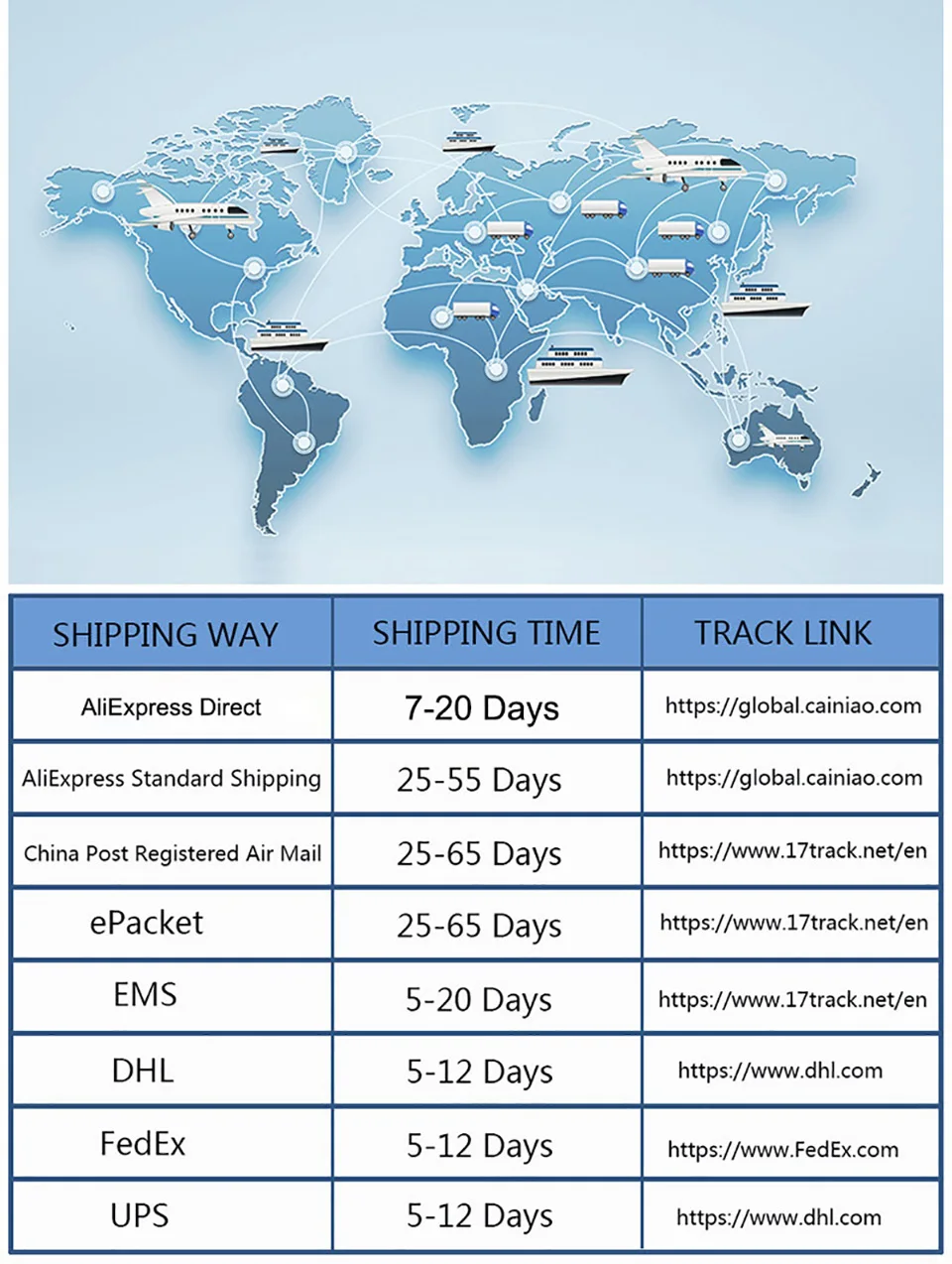 Вы можете запросить информацию о доставке номера отслеживания из вышеуказанной таблицы.