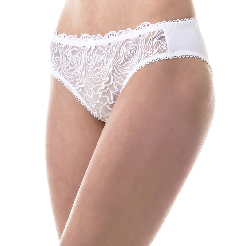Трусы изготовлены из мягкой микрофибры. Передняя часть полу-прозрачная ткань с вышивкой зубчатый верхнему краю. Есть небольшой атласный бант в центре трусы. Ластовица изготовлена из хлопка.