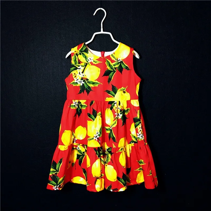 Элемент: Свободные плиссированные платья без рукавов с короткими рукавами; Цвет желтый, красный, темно-синий; Праздничные платья с принтом лимона; Комплект из одного предмета; Пляжные юбки для девочек