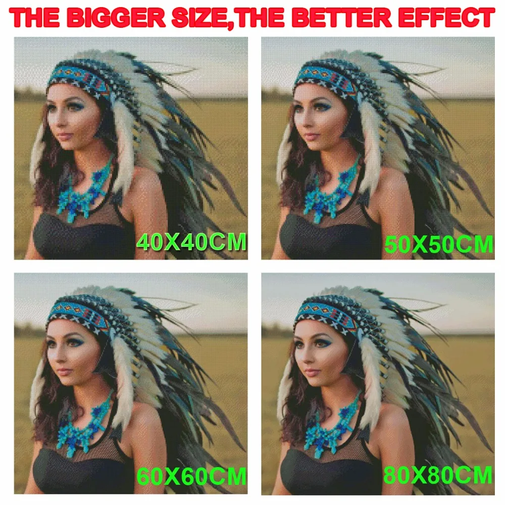 Чем больше размер, тем лучше эффект! Каждый размер алмаза: 2.5x2.5мм. Если изображение сложное, маленький размер будет не очень хорошим! Если вам нужен большой размер любых фотографий, пожалуйста, свяжитесь с нами!
