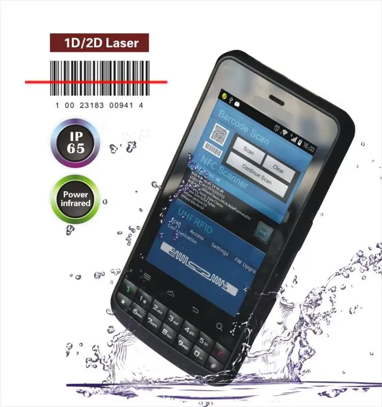 1: ОС Android 4.1.2 2: функции: сканер штрих-кодов 1D + считыватель NFC 3: поддерживает: Wi-Fi, Bluetooth, GSM/3G, GPS, камеру 4: прочный: степень защиты IP65 5: для вашей второй разработки будет предоставлен Бесплатный SDK Основная спецификация: