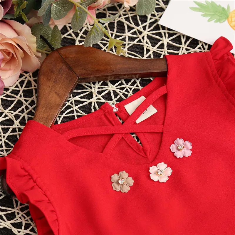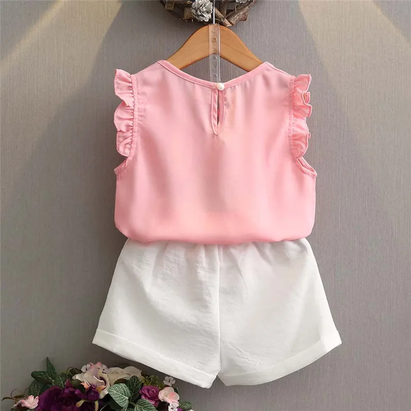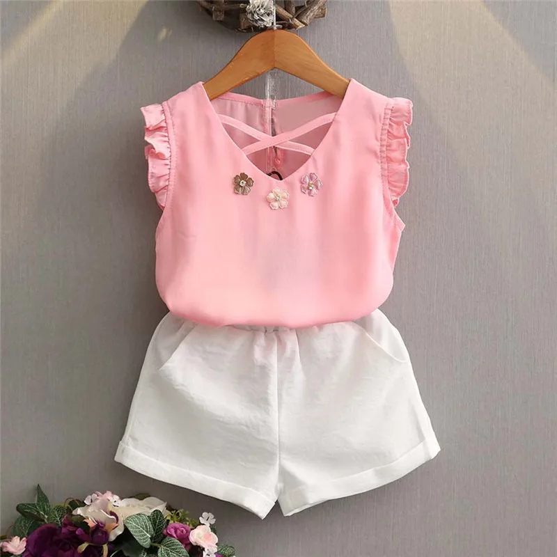 Удобная детская одежда Лидер продаж, детская одежда комплект одежды из 2 предметов для маленьких девочек шифоновый жилет, футболка + шорты, комплект со штанами