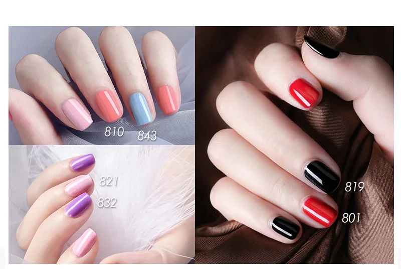 801 - 850 гель-лак для ногтей в стеклянных флаконах, используйте его спраймером, базовым и верхним слоем праймер высыхает на воздухе, но базовый слой, цветной гель-лак для ногтей и верхний слой необходимо отверждать под УФ-лампой для ногтей