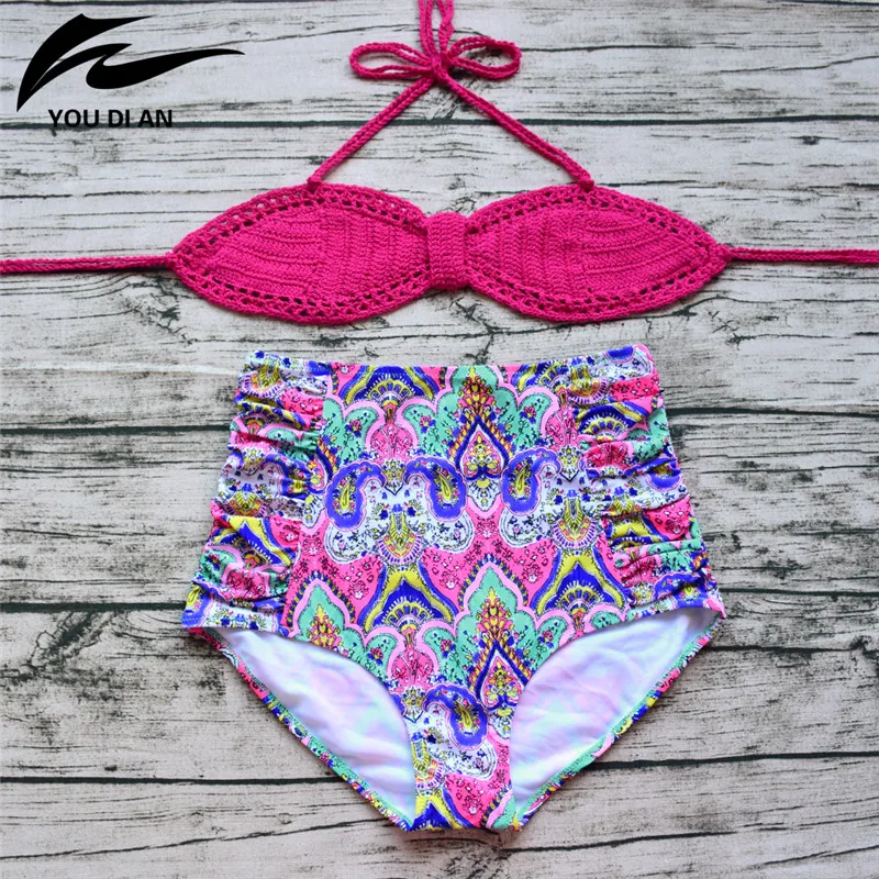 бикини 2016 Летом Высокая Талия Бикини Крючком Розовый Топ Женщины Ручной Холтер Бикини Устанавливает Сексуальная Push Up Бикини Купальник Biquini