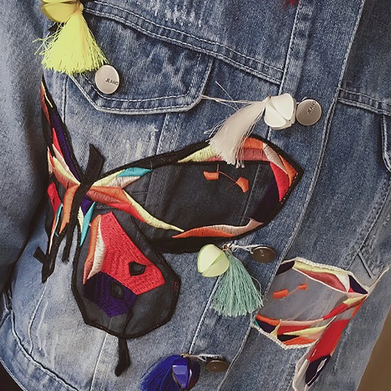 OLGITUM красочный вышитая заплатка в виде бабочки дизайнов, женская джинсовая ткань с кисточкой короткая обтягивающая куртка JK189