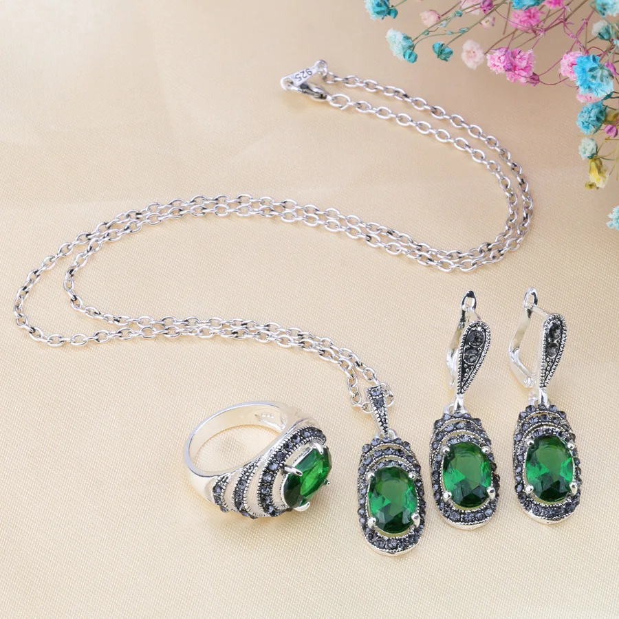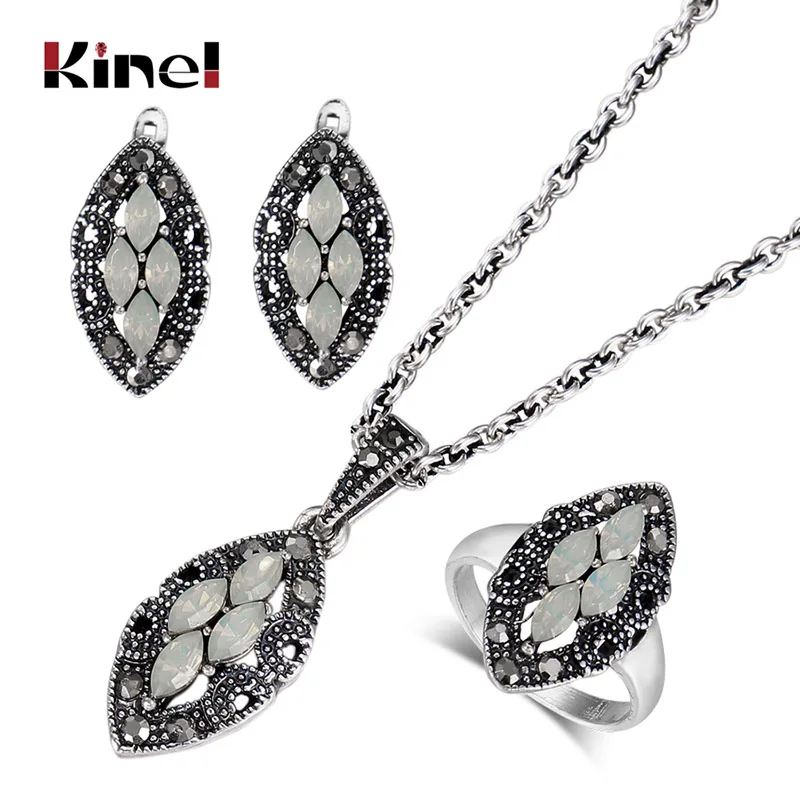 Kinel женские модные ретро ювелирные наборы античный серебряный цвет мозаика зеленый циркон кулон ожерелье и серьги кольцо ювелирный набор
