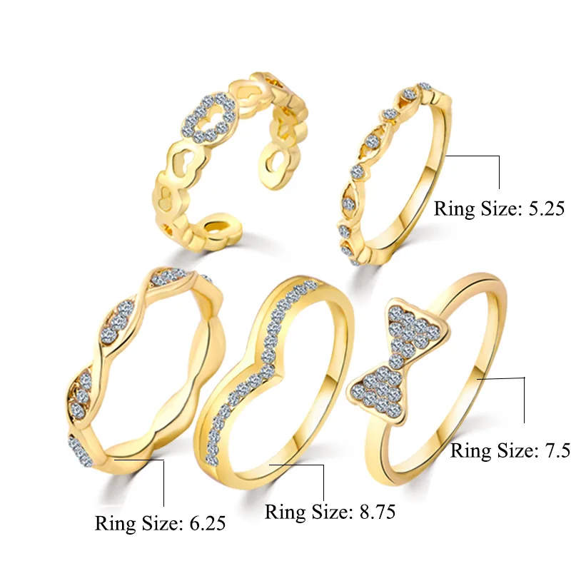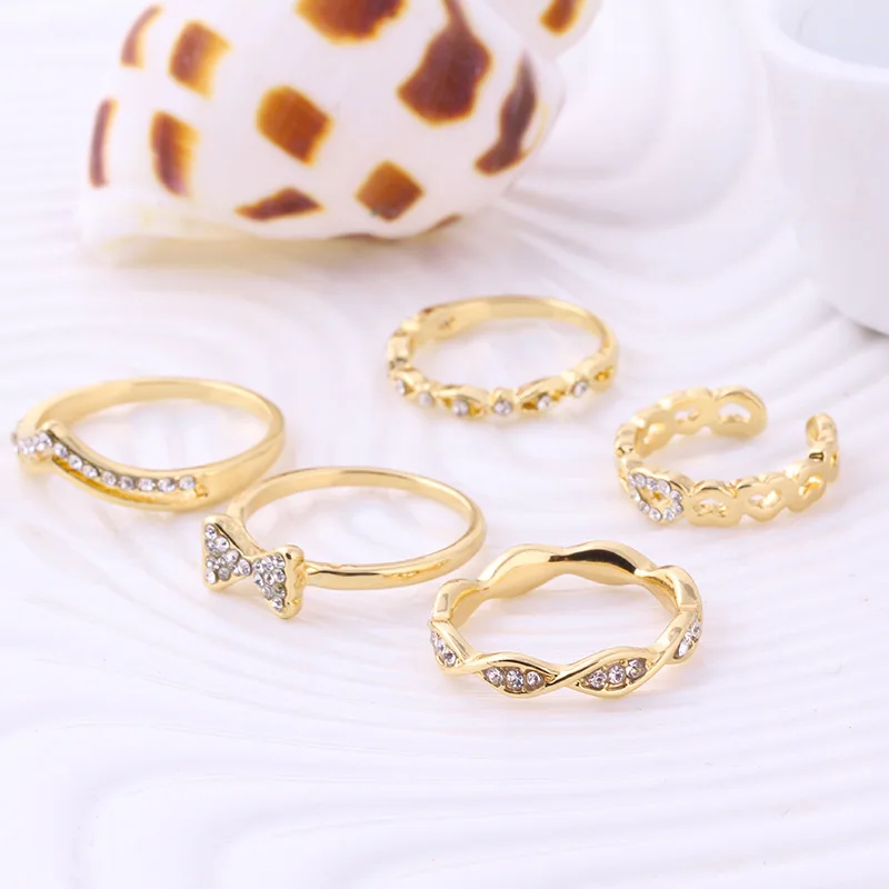 5 шт./компл. Новая мода стразы стиль Серебряный Золотой цвет кристалл лук палец кольца для женских колец наборы модные украшения JZ105