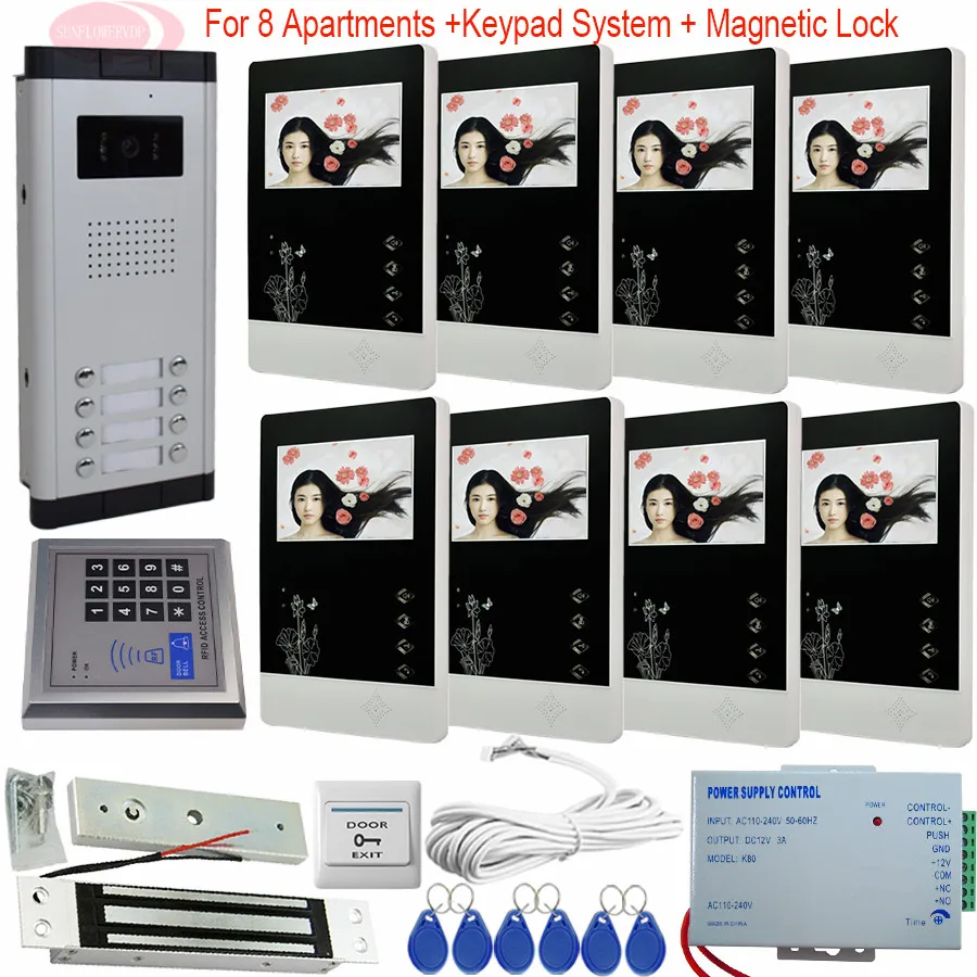 8 кнопок наружный блок + 8 шт 4,3-дюймовые цветные экраны + 1 кнопочная система контроля доступа + 1 электромагнитный замок для 8 квартиры