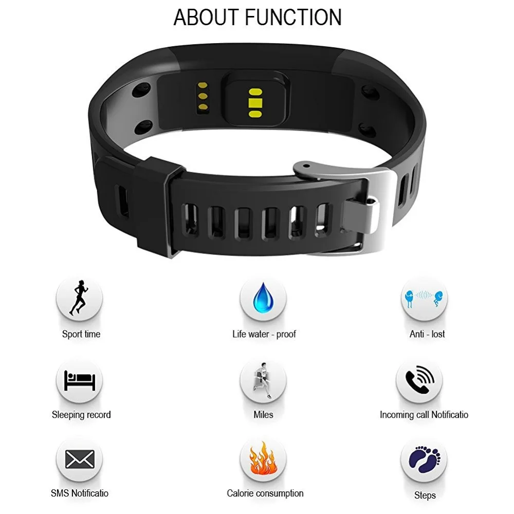 Heart rate monitor, Time, Pedometer, distance monitor, Calorie monitor, Alarm clock, finding phone, sleep monitor, camera remote capture. Vibration remind: clock alarm, sedentary, calling number display notification, SMS synchronous notification.0.86 inch OLED display ;TPU Wristband material :3 axis G-sensor Acceleration; Charge by clip charger; lithium-ion polymer rechargeable battery; 20-25 days standby time; 26g net weight.Heart Rate Monitor: The product with optical heart rate sensor, detect real time heart rate and give you useful tips when you do some exercise, catch accurate heart rate.High sensitive touch key and press key operation. Gesture control, turn the wrist lit screen. Waterproof IP65 ,not afraid of washing hands/ doing housework/ walking under rain (But please don\'t wear it to swim).Before using the wristband please download the APP on your smartphone according instructionsSupport Android 4.4 and above, IOS 7.0 and above.Bluetooth Heart Rate Monitor Smart Bracelet Description