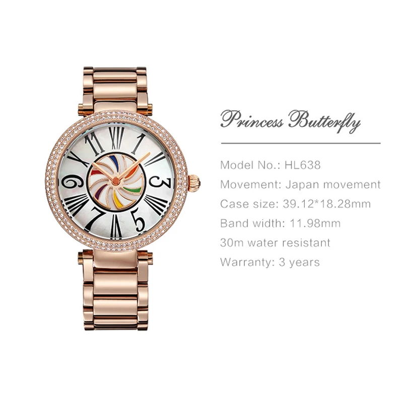 Эти часы имеют кристаллическую рамку и Простой циферблат с римскими цифрами с красочным дизайном ветряной мельницы, что делает их подходящими для широкого диапазона случаев. Пожалуйста, поверьте, что наши часы будут красивее, чем на картинке, и обязательно принесет вам сюрприз после получения! Бренд: Princess Butterfly Часовой механизм: кварцевый Глубина водонепроницаемости: 3 бар Тип застежки: скрытая застежка на кнопке Тип ремешка: нержавеющая сталь Тип материала окна циферблата: Hardlex Часы на границе, с украшением в виде кристаллов Упаковка: Бархатная подарочная коробка
